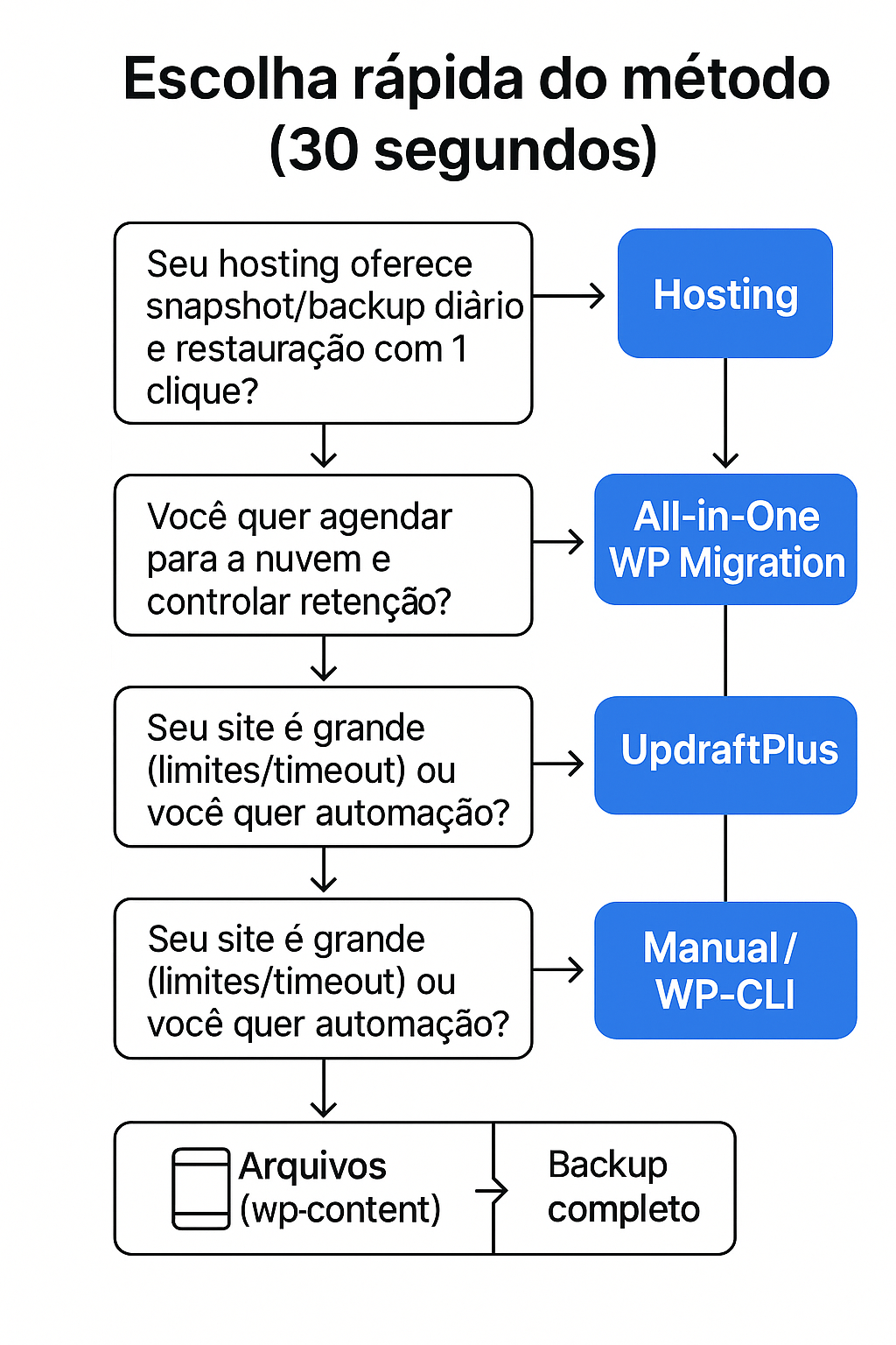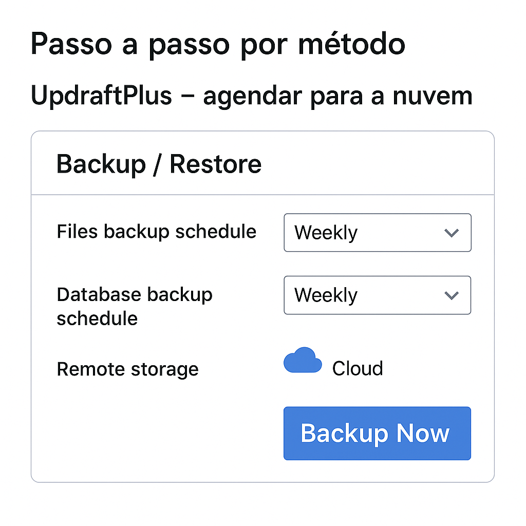 - Pouco espaço? Prefira incrementais (UpdraftPlus) e limpe versões antigas.