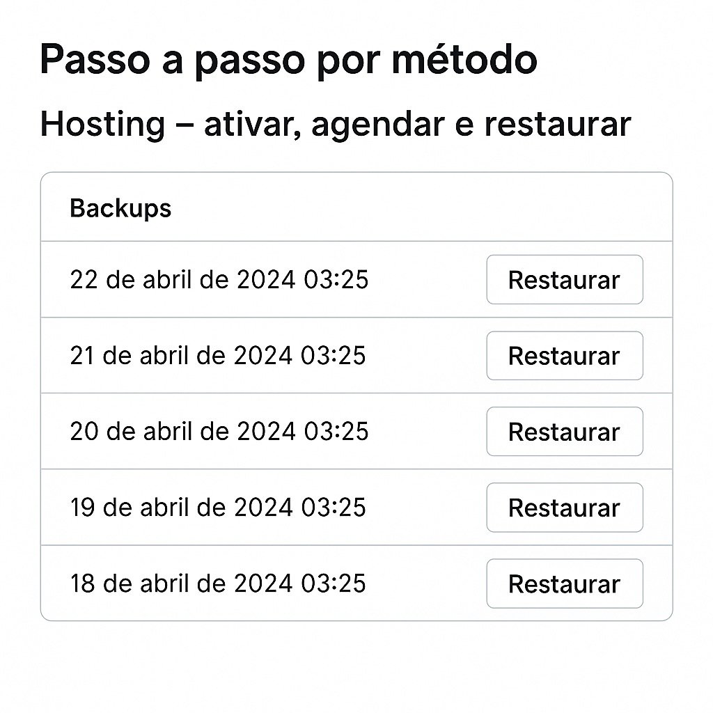 - Hosting: escolha o snapshot e restaure (arquivos + banco).