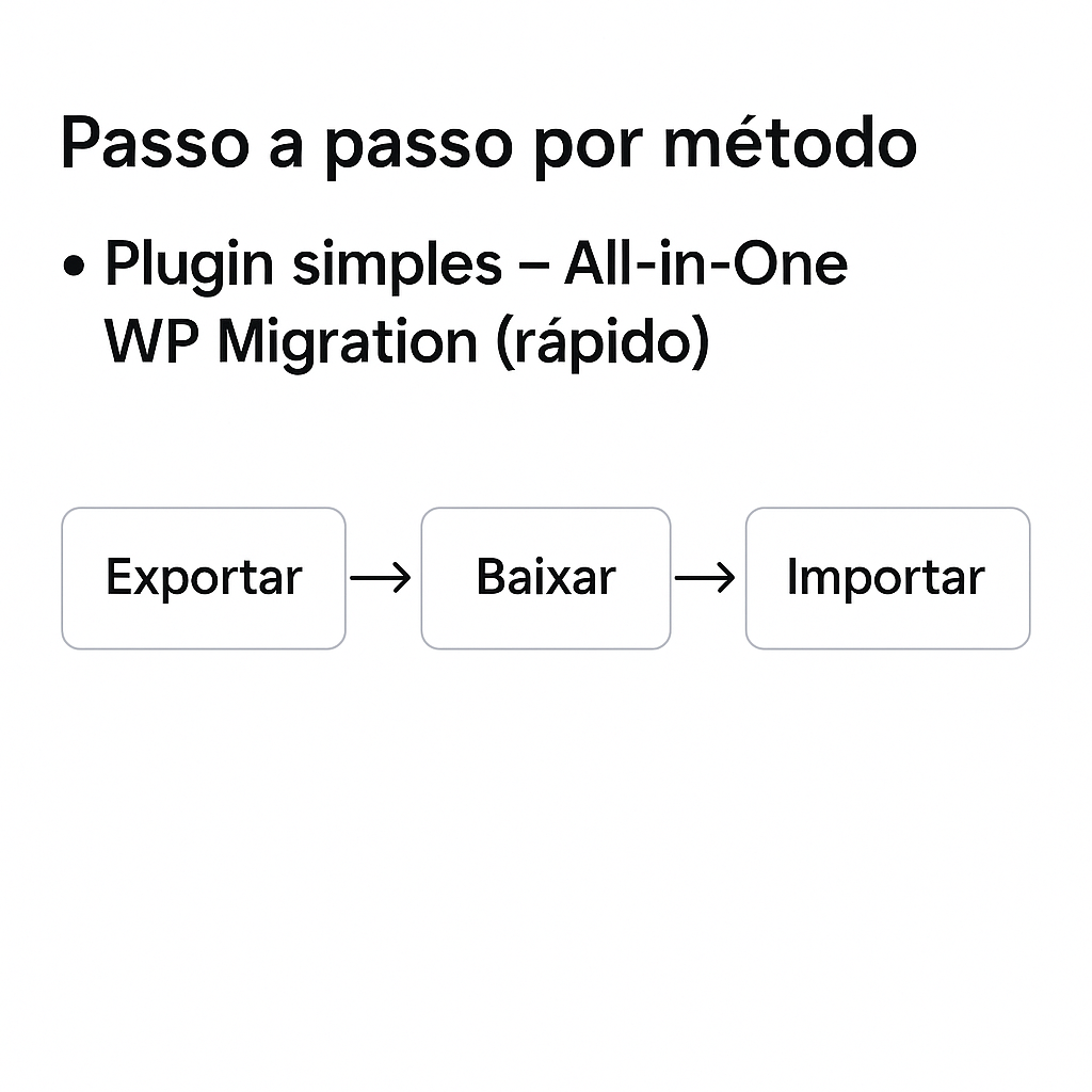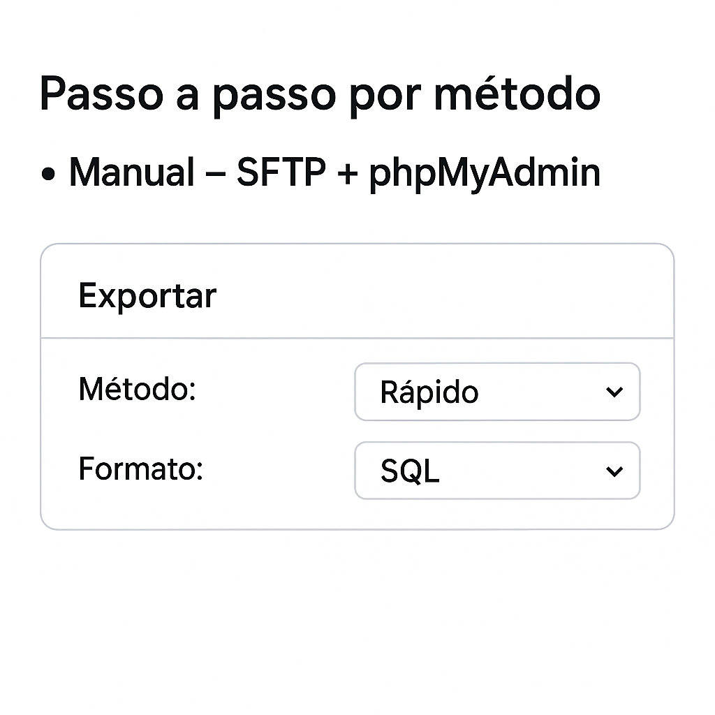 - Manual: Suba wp-content/ por SFTP → importe o .sql no phpMyAdmin → ajuste wp-config.php se necessário.