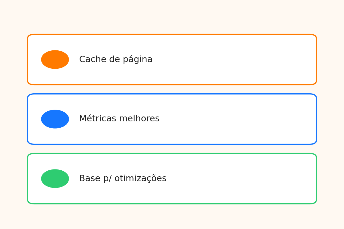 - Base sólida para otimizações finas (imagens, CSS/JS, preload)