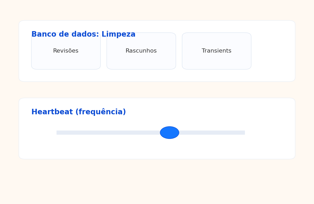 - Limpeza de banco: revisões, rascunhos, transientes — programe mensalmente.