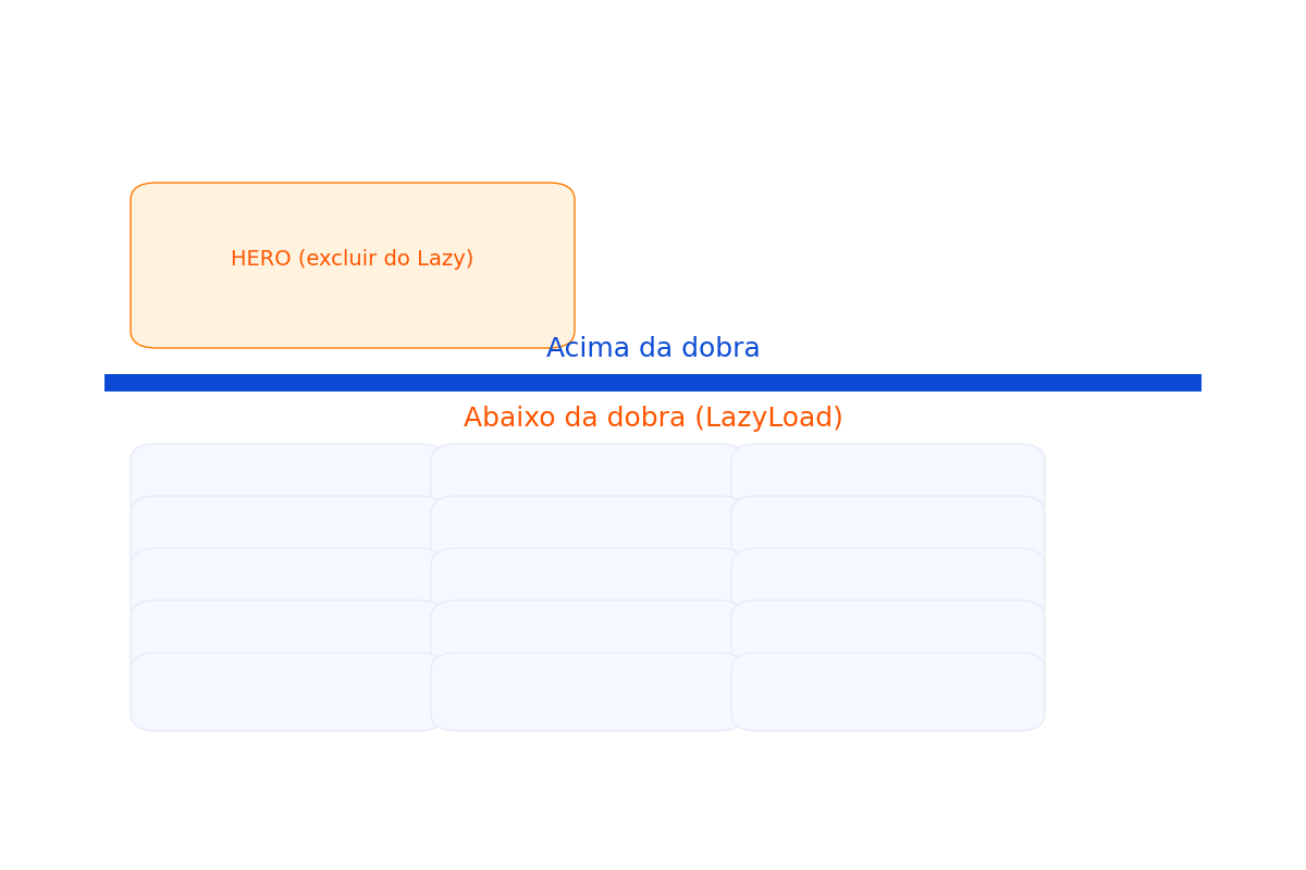 - Exclua imagens “acima da dobra” (logo, banner hero, ícone do menu) para não atrasar o LCP.