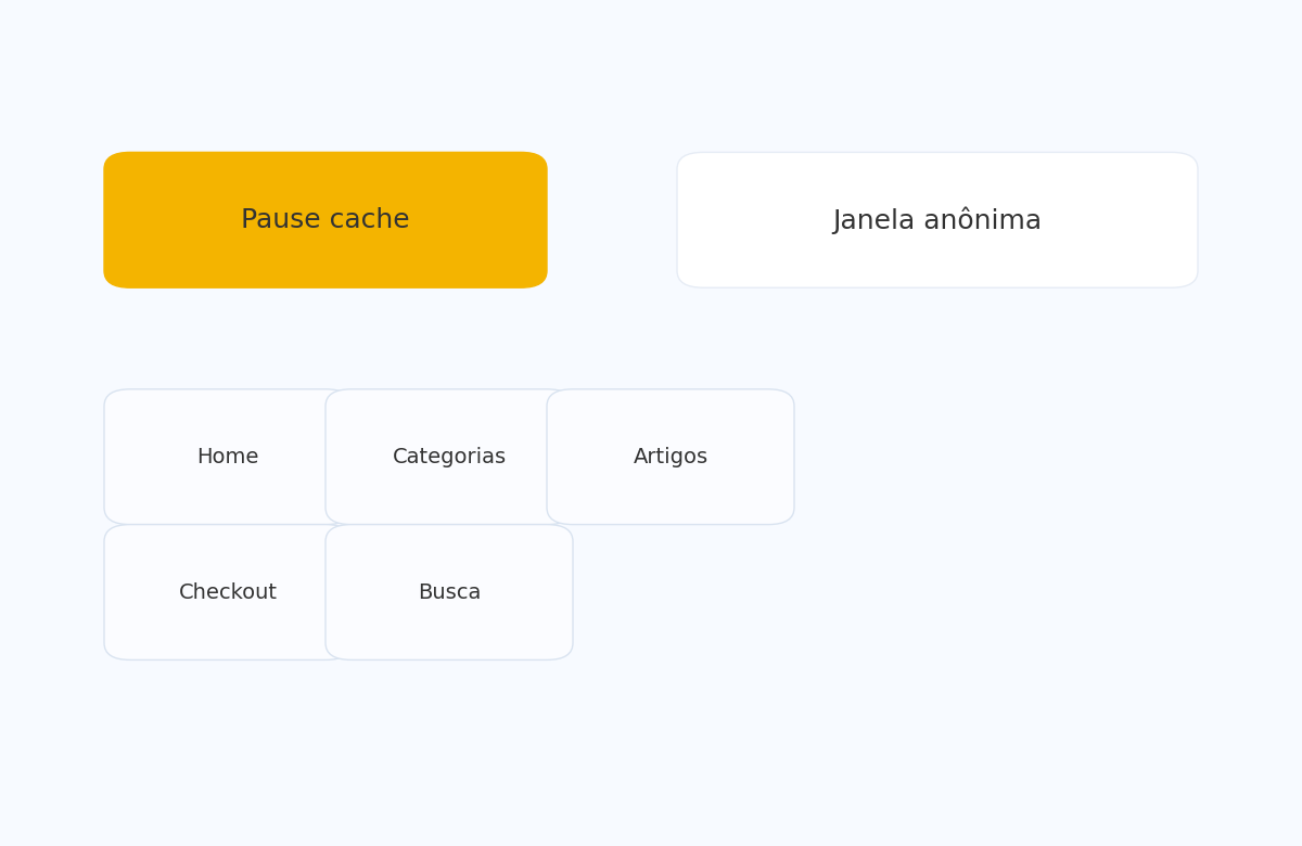 - Páginas sensíveis: carrinho/checkout, login, busca, “minha conta”