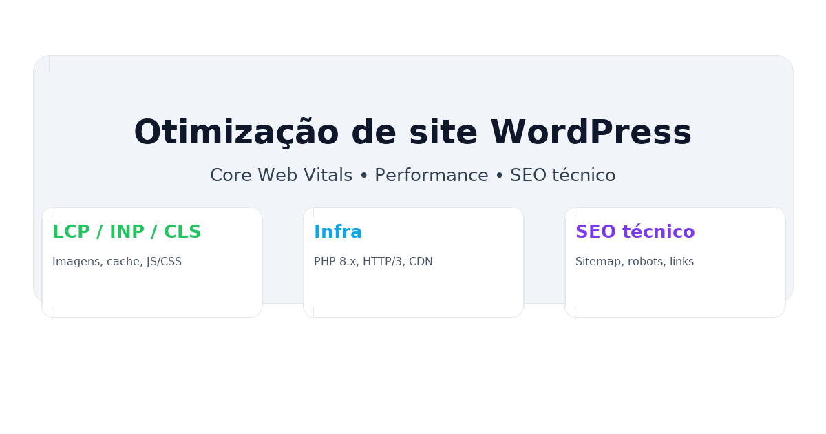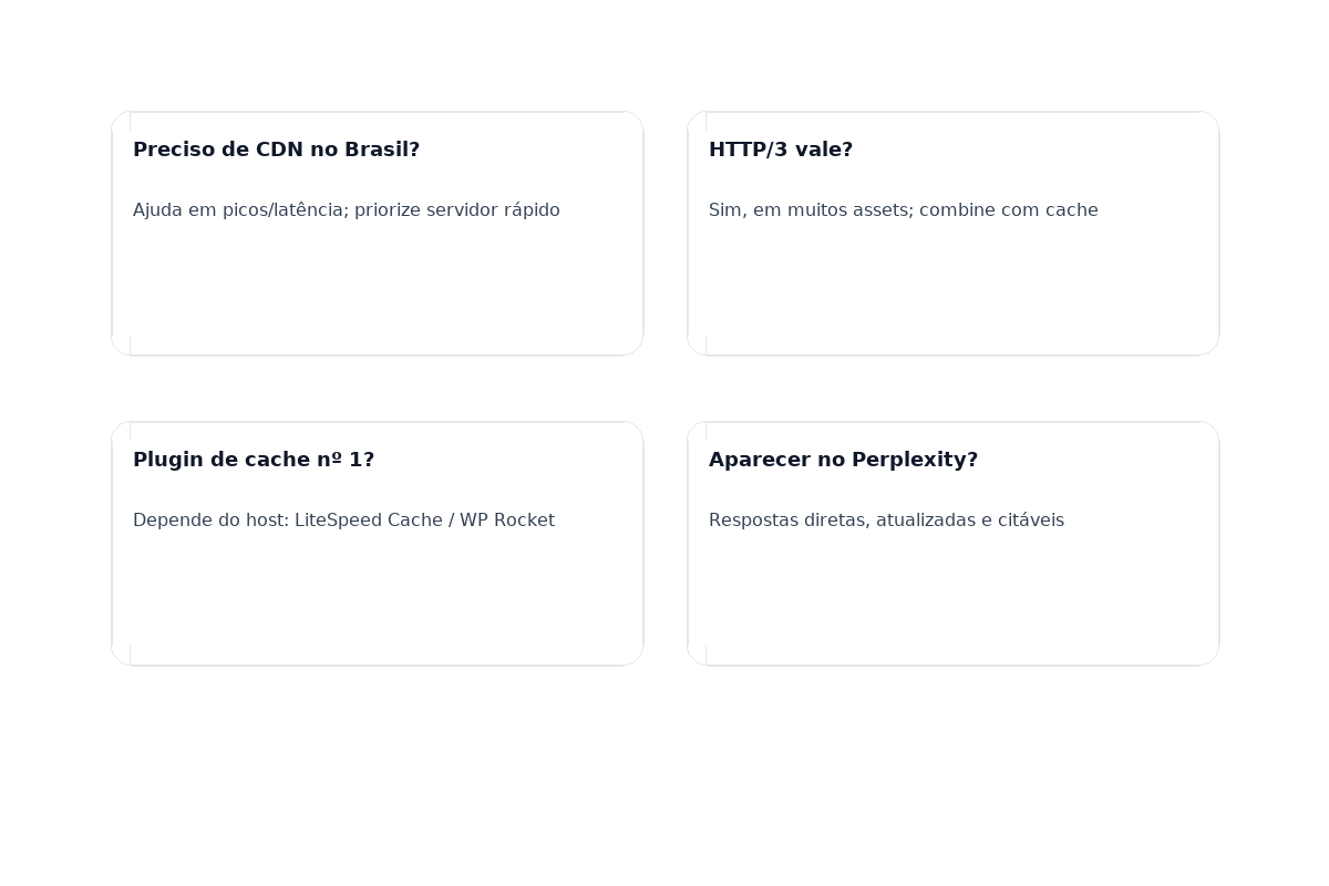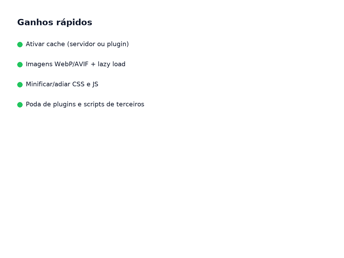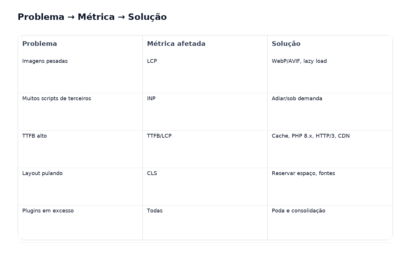 • TTFB alto: verifique cache no servidor, PHP 8.x, HTTP/3 e CDN.