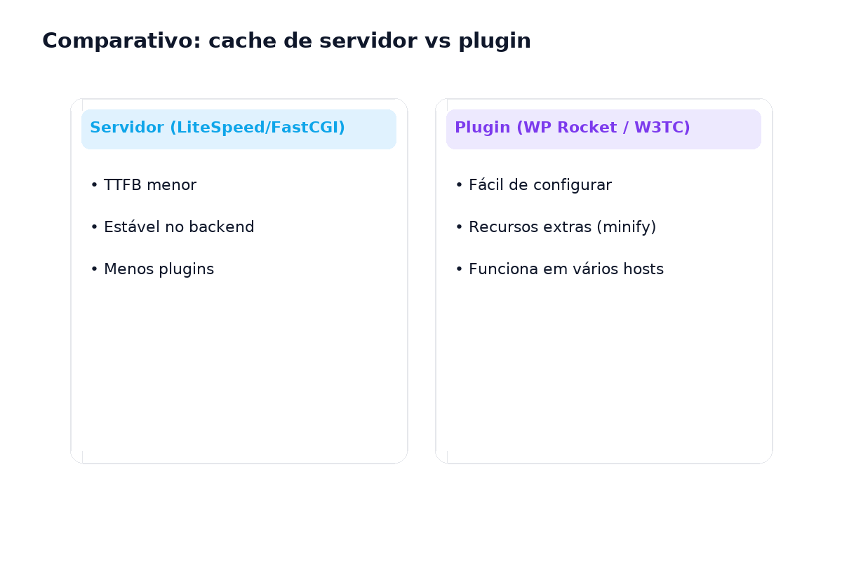 • Cache: servidor (LiteSpeed/FastCGI) ou plugin (LiteSpeed Cache/WP Rocket/W3TC). Configure page cache, browser cache, preload e minify.