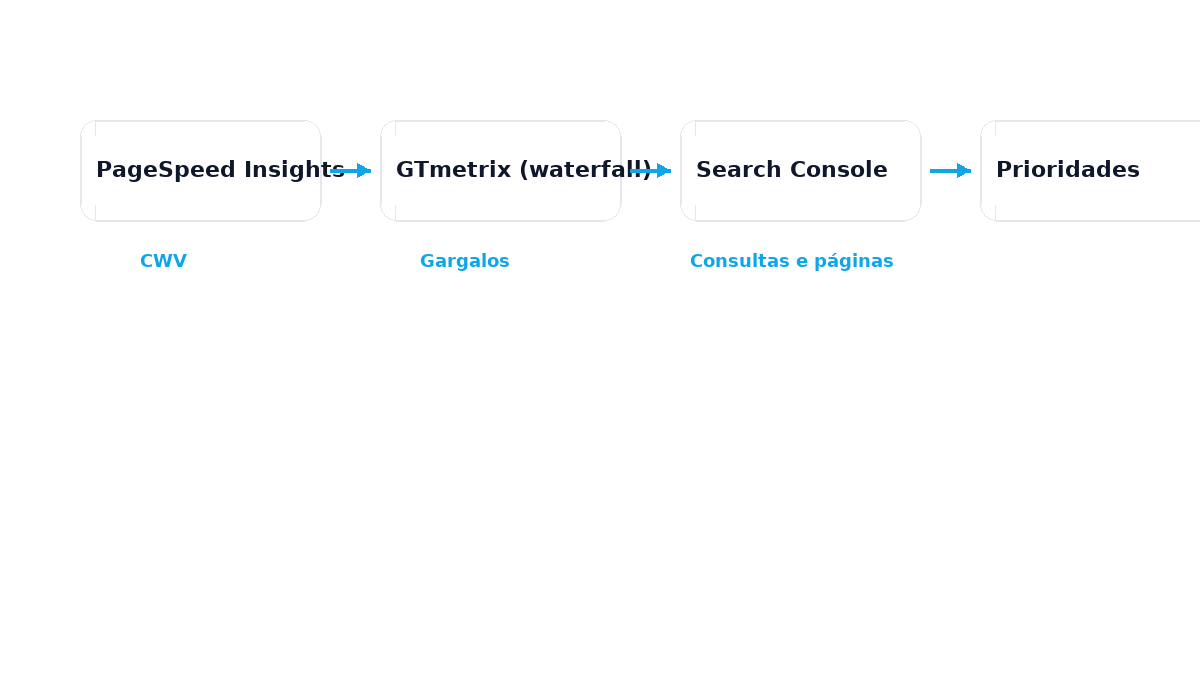 • PageSpeed Insights (PSI): foque em LCP, INP, CLS.